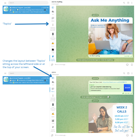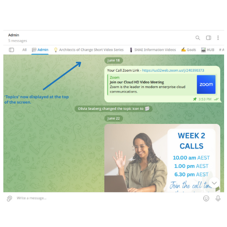 In Telegram you will see we have set up 'Topics', (or tabs) for:- Admin