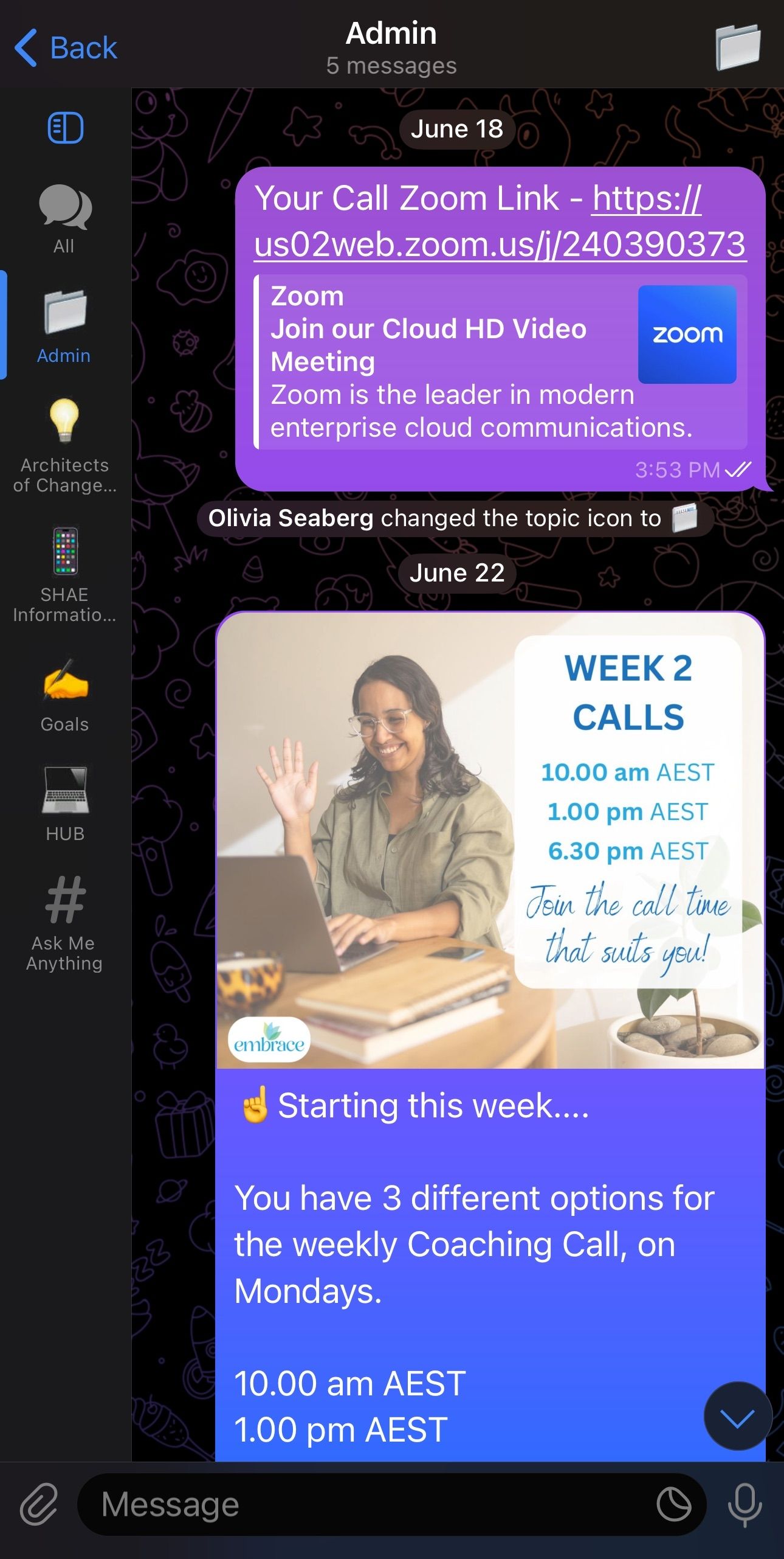 The embrace Program - June 2025  Telegram Group will run alongside the Facebook group while we all get used to this new tool. What is in Facebook will also be in Telegram. The benefit of Telegram is that you will always be alerted of new communications, and the most recent information will be visible first, rather than in Facebook where it can sometimes get buried.